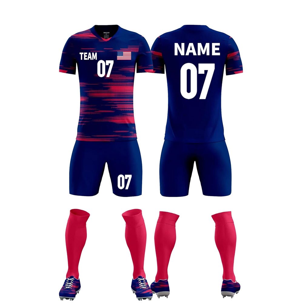 Product: Personalized soccer Uniform. Material: 100% polyester Features: Breathable, Quick Dry, Absorbent Technics: Full Sublimated Printing Color fastness: Level 4 Design: Custom Design Colour: Custom Color Size: Custom Size Logo: Screen printing, heat transfer, sublimation, embroidery